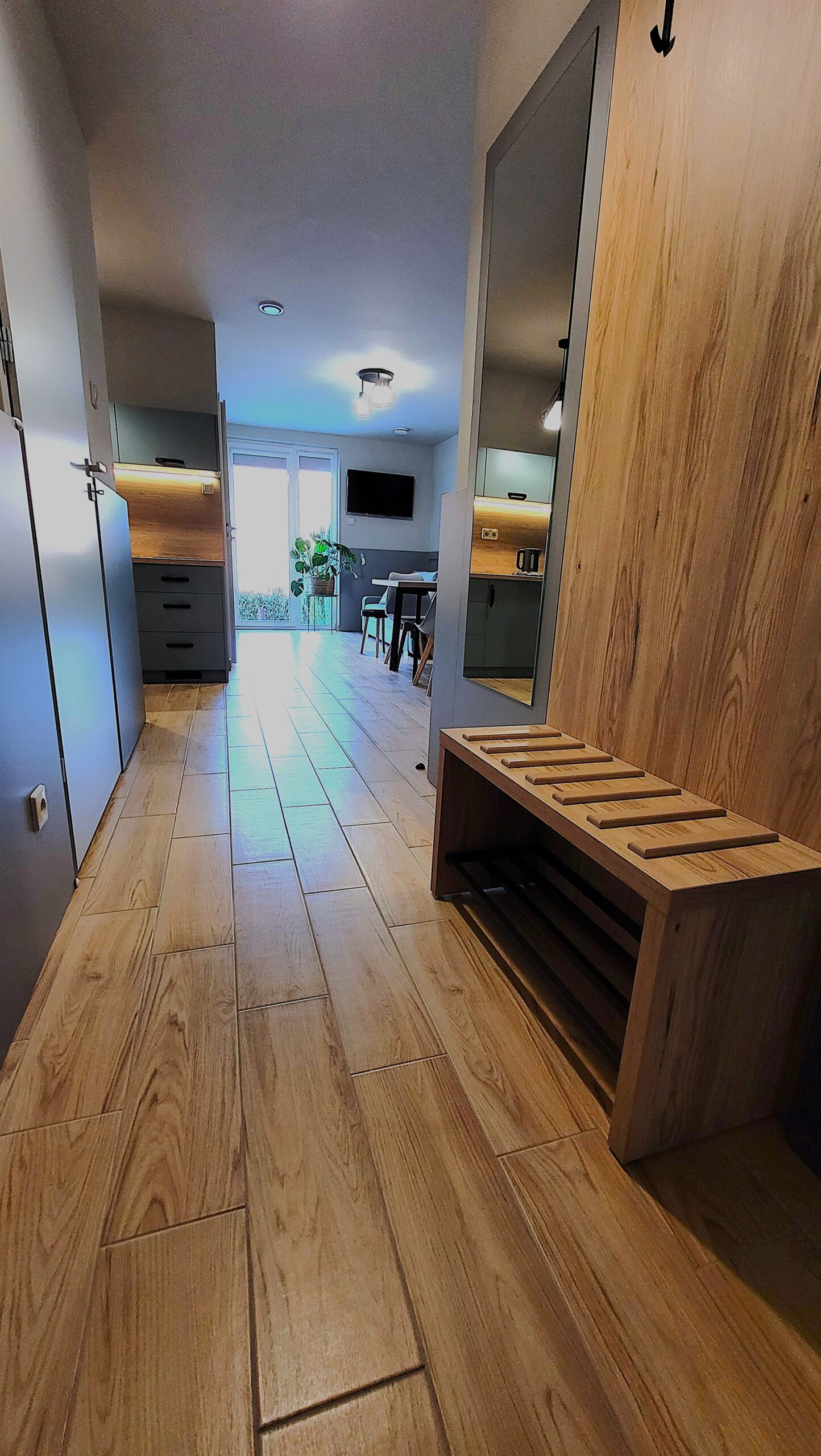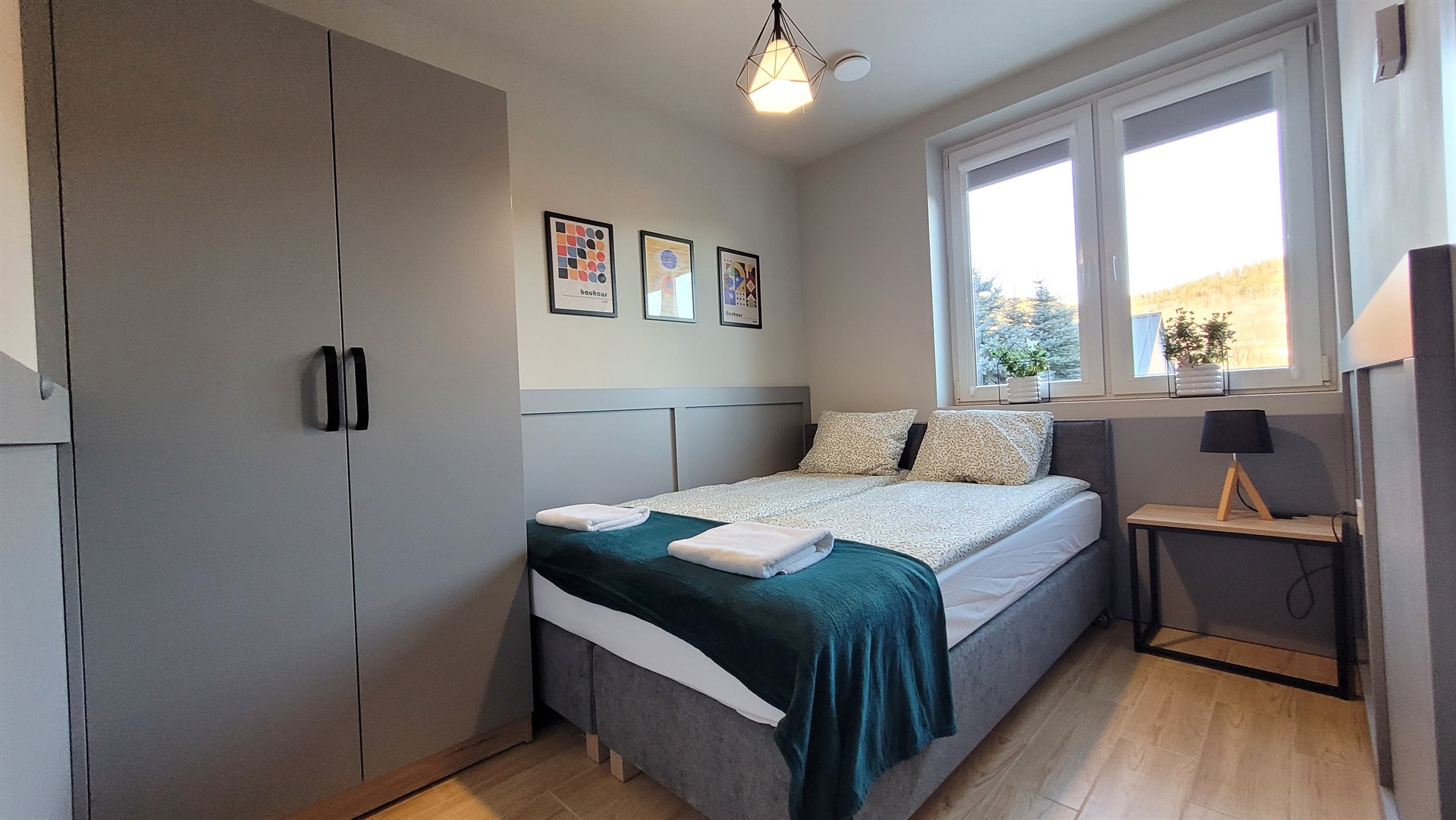 Apartament nr 2 w Domku Snowboardera, posiada wyjście na taras, bezpośrednio do ogrodu. Odpowiedni dla 4-5 osób. Składa się z dwóch sypialni, przedpokoju, pokoju dziennego i łazienki. W przedpokoju znajduje się wieszak na odzież, szafka na buty i lustro. Obie sypialnie wyposażono w dwa pojedyncze łóżka z opcją łączenia w małżeńskie, stoliki i lampki nocne, szafy na odzież. W salonie znajduje się szafa, kanapa z opcją spania (120cm na 200 cm), stół z krzesłami, aneks kuchenny z lodówką, dwupolową płytą elektryczną, ekspresem do kawy, czajnikiem, zlewozmywakiem. Na wyposażenie aneksu składają się garnki, patelnia, naczynia, sztućce, szklanki, kubki oraz przyrządy kuchenne. Łazienka z kabiną prysznicową walk in, grzejnikiem elektrycznym. W apartamencie jest ogrzewanie podłogowe.