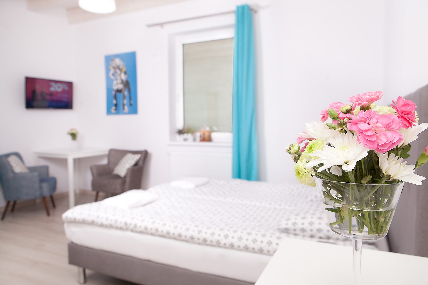 Studio z aneksem kuchennym, łazienką i wyjściem na taras. Na wyposażenie pokoju składają się dwa łóżka kontynentalne z możliwością złączenia w łóżko małżeńskie, szafa, stół, krzesła, komoda, szafki i lampki nocne, meble ogrodowe, kabina prysznicowa w łazience. Aneks kuchenny wyposażony w lodówkę, czajnik elektryczny, zlewozmywak, naczynia, sztućce, przybory kuchenne, jednopolową płytę grzewczą.